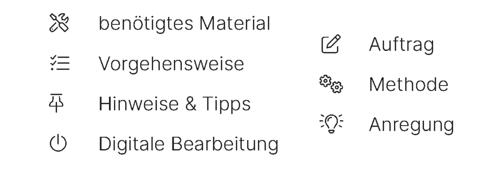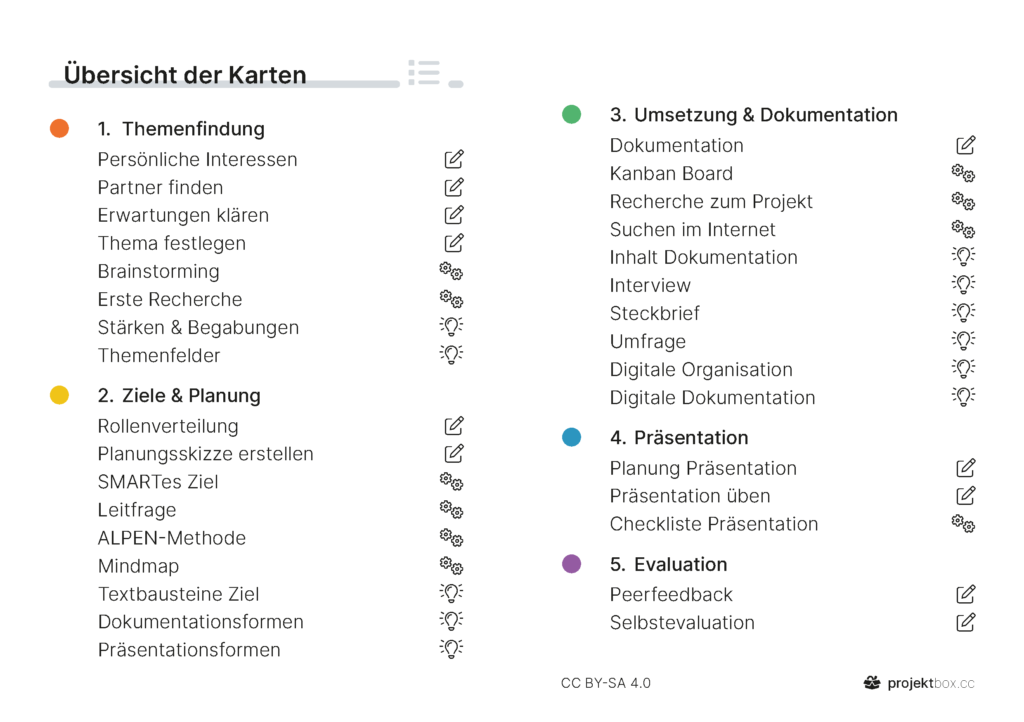 Innerhalb jeder Phase werden verschiedene Arbeitsschritte erarbeitet. Diese Arbeitsschritte werden anhand dreier verschiedener Ansätze bearbeitet, diese sind auf den Karten ersichtlich und unterscheiden sich in Auftragskarten, Methodenkarten und Anregungskarten.